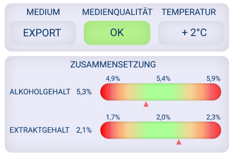 Durch die stetige Vermessung und Ermittlung des Extraktgehaltes sowie des Alkoholgehalts in Echtzeit kann der Gärverlauf konstant überwacht werden. In Verbindung mit der präzisen Temperaturmessung des SONEM SLA V5 ist eine Onlineüberwachung des gesamten Prozesses möglich.